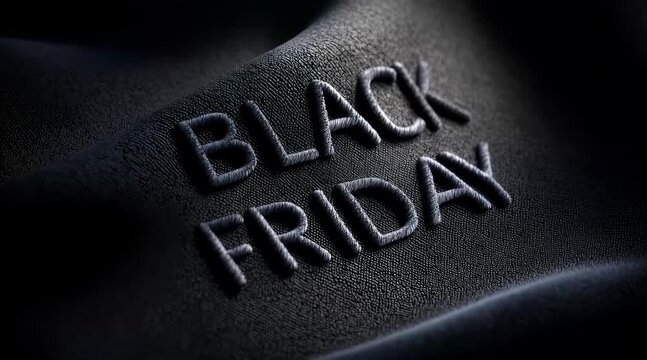 Bold letters spelling Black Friday stand out against a textured black fabric, symbolizing shopping frenzy and discounts. The image captures the excitement of holiday sales.
