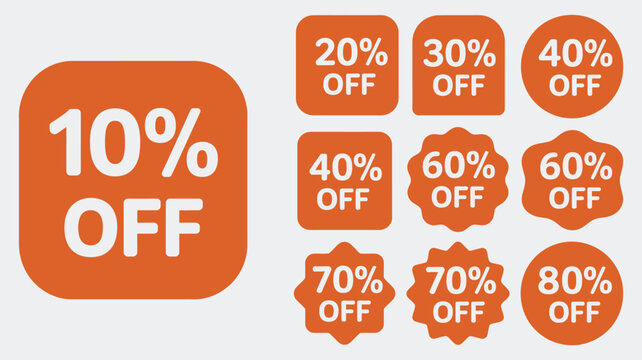 Red sale stickers and badges featuring bold percentage discounts from 10 to 80 percent designed for promotional vector graphics, marketing banners, and seasonal advertising layouts