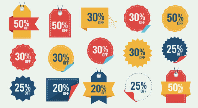 Collection of Colorful Discount and Sale Tags with Various Percentage Off Offers.