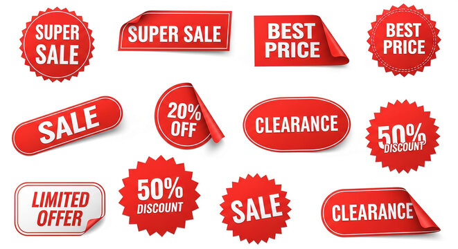 Collection of red labels with different shapes, presenting sale phrases, symbolizing promotion, offer, and bargain, good for marketing material