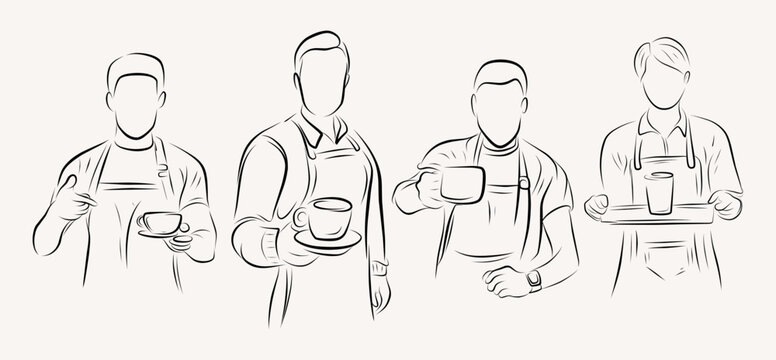 Doodle set barista making coffee. People, hands, men and women, cup of coffee and milk. Vector linear hand drawn illustration
