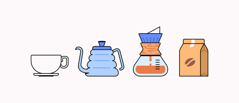 Coffee brewing tools including a cup, gooseneck kettle, pour over dripper, and coffee bean package. Hand drawn outline cartoon style, perfect for cafe design, barista concept vector illustration