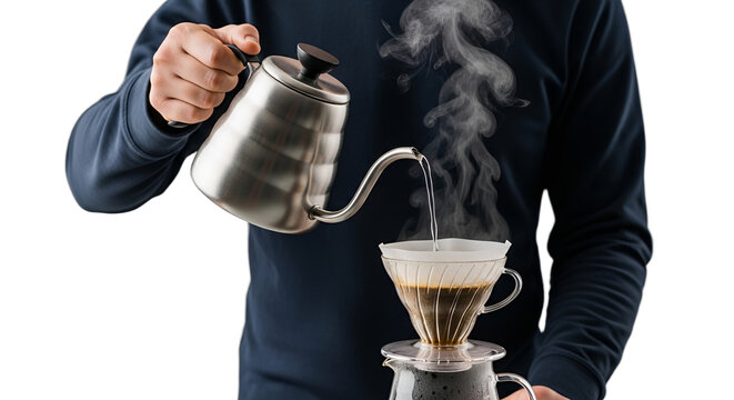 Skilled barista meticulously pours hot water into a pour-over coffee dripper, crafting a fresh and aromatic brew in the tranquil ambiance of a modern coffee shop