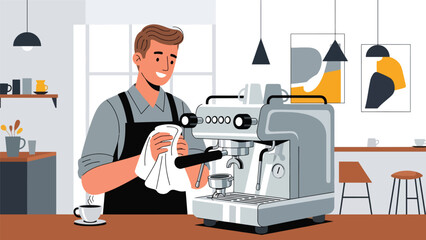 Smiling female barista with blue bandana preparing coffee at espresso machine in cafe. Hospitality industry, barista. Coffee culture, specialty beverage preparation. Customer service, cafe experience