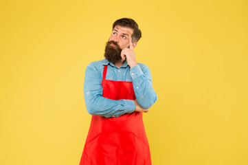 chef posing in kitchen. Confident expression. Handsome male barista is working. mature bartender. his new business. guy in shop assistant uniform. thinking man with red apron on yellow background