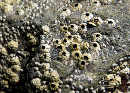 Colony of barnacles on formation of volcanic rock on seaside shoreline.