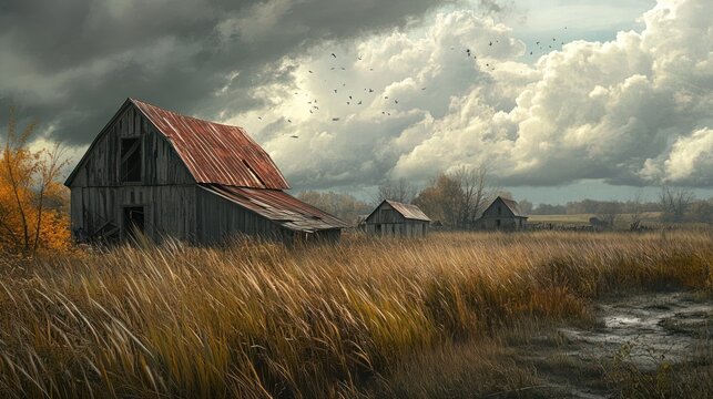 A cluster of abandoned barns and sheds in a rural landscape, their roofs collapsing under the weight of years, surrounded by tall grasses swaying in the breeze under a cloudy sky.