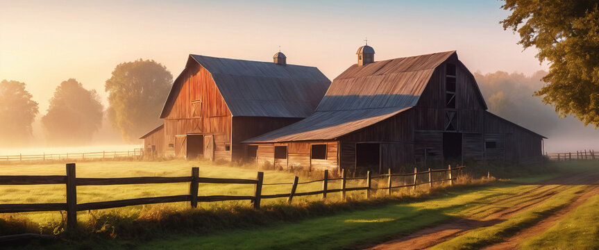 Sunlight shines on wooden barns and a split-rail fence in a misty field at sunrise, creating a peaceful rural scene.
