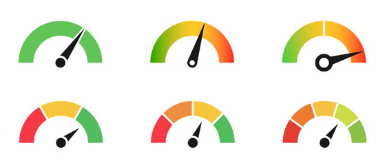 Speedometer gauge meter icons. Scale, level of performance. Speed indicator .Infographic of risk, gauge, score progress.