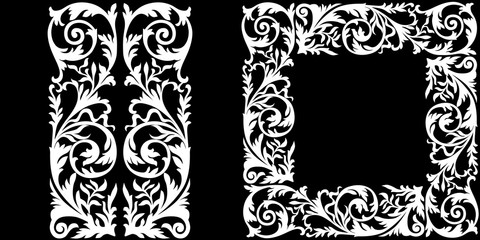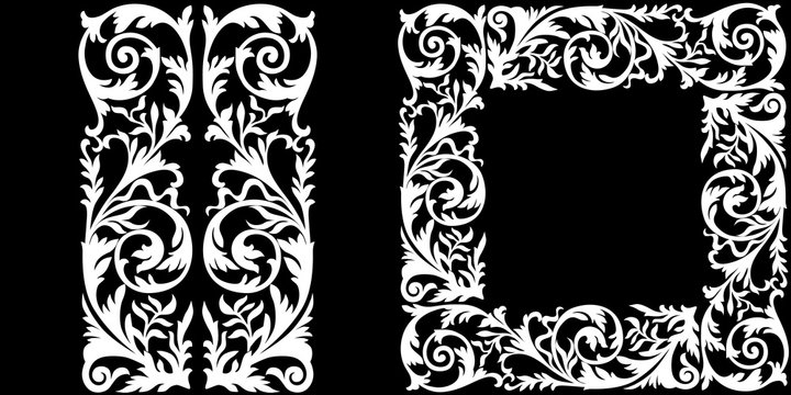 Vintage baroque frame scroll ornament engraving border floral retro pattern antique style acanthus foliage swirl decorative design element filigree calligraphy.