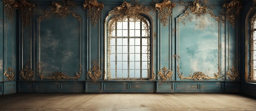 Baroque style windows adorn an antiquated room with a grunge interior