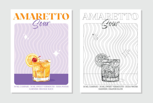 Cocktails retro posters. Amaretto sour cocktails. Popular alcohol drinks. Vintage style vector illustrations, bar, pub, restaurant, kitchen wall art