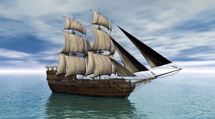 Sailing ship on a calm ocean, 3d digitally rendered illustration