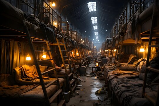 Empty refugee camp barrack filled with bunk beds