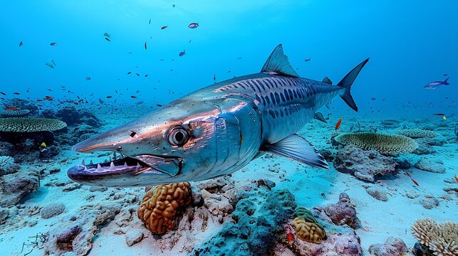 A menacing barracuda swims horizontally across the ocean floor, its sharp teeth and piercing gaze exuding a sense of predatory power.