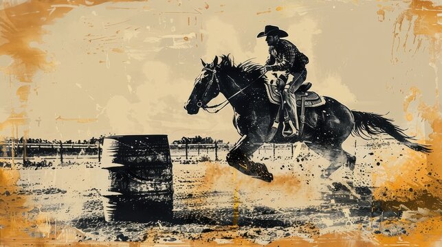 Dynamic Barrel Racing Action with Cowboy Riding a Galloping Horse in a Dusty Arena