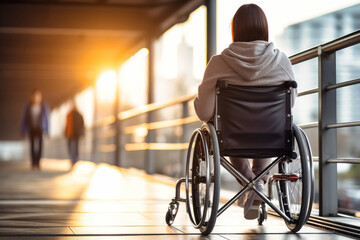 A disabled woman in a wheelchair on a ramp in the city. Support. Social problems. Infrastructure for people with disabilities.