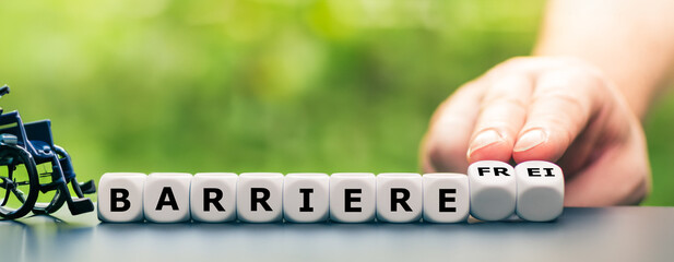 Hand drawing a words barrier free with a question mark and a disabled man in a wheelchair in front of stairs with turquoise and yellow chalk on a blackboard in timelapse. Urban accessibility problem