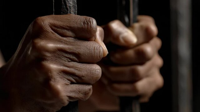 Close up of two hands gripping steel bars in dark setting depicting incarceration, justice, or confinement themes