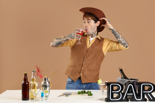 Shocked male bartender dressed as cowboy with glass of cocktail at table on beige background