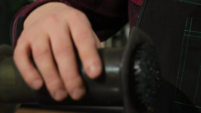 Experienced cobbler repairing shoe in workshop with machine