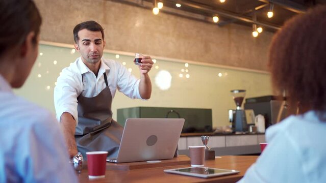 Handsome barman having fun at bar counter in bakery.