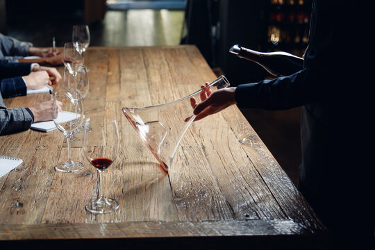 Sommelier pouring red wine into carafe decanter to make aeration drink. Concept training bartenders and waiters