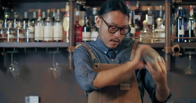 A young professional Asian bartender is expertly making cocktails. A young man in glasses and apron is mixing cocktail ingredients for a shake at a hotel restaurant bar.