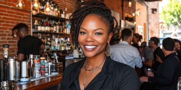A smiling bartender stands at the bar, surrounded by a busy crowd. The lively atmosphere is enhanced by warm lighting and rustic decor, inviting patrons to enjoy their evening