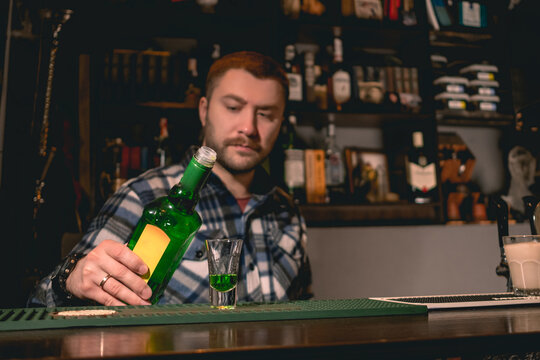 Confident bearded bartender pouring green liquor from bottle into shot glass