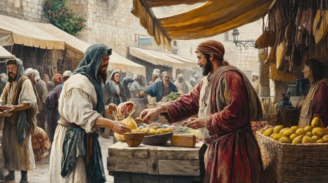 Medieval marketplace barter exchange between two traders offering crops and tools. Busy market scene with a historical focus on trade. Concept for design and print.