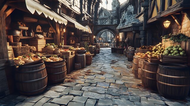 Medieval Marketplace Variety Goods Barricades Stock Photo