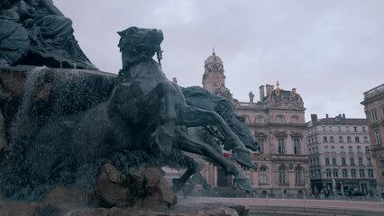 Gros plan sur la Fontaine Bartholdi et ses chevaux de la Place des Terreaux, Lyon, France