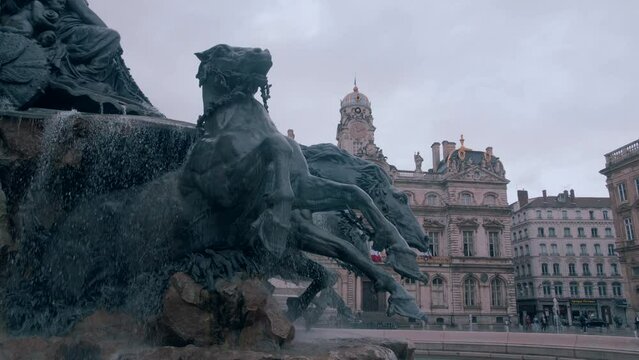 Footage of Fontaine Bartholdi at Place des Terreaux in the City of Lyon a famous sculpture in the city. In background the Hotel de ville of the city