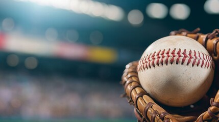 Close-up baseball glove catching ball with vibrant banners and advertising boards in background.