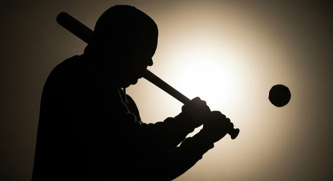 Baseball Silhouette:  A lone batter stands poised against the setting sun, ready to swing for the fences in a silhouette image that captures the intense anticipation and power of the game.