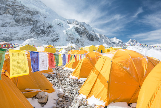 Orang,  red and blue  tents in the Everest base camp. Mountain peak Everest. Highest mountain in the world. National Park, Nepal.