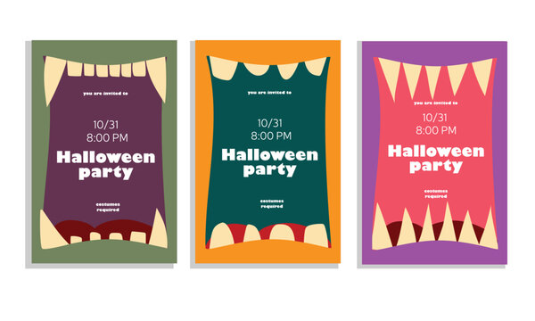 Invite card with monster open mouth for Halloween. Minimal scary vector illustration with vampire teeth