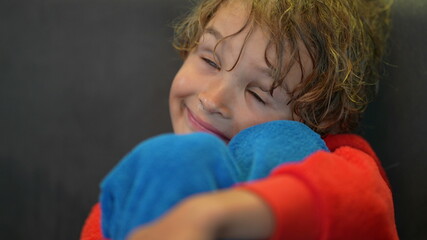 An adorable and shy cartoon creature with blushing cheeks and a devil-like tail, looking anxious or bashful on a plain pink background with copy space.