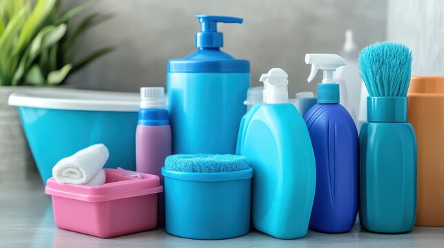 Collection of blue and pink bottles containing basic sanitation and cleaning supplies for household hygiene