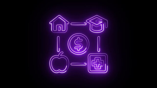 glowing neon basic needs free icon isolated, futuristic human essentials visualization, food shelter water clothing health digital representation hd video motion graphic animation