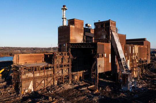 Aerial of Rusted and Basic Oxygen Furnace and Caster Undergoing Demolition at Sunset - Abandoned Armco Steel / AK Steel Ashland Works - Russell and Ashland, Kentucky