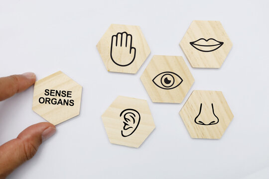 The five senses are illustrated as icons: vision, hearing, smell, taste, and touch.