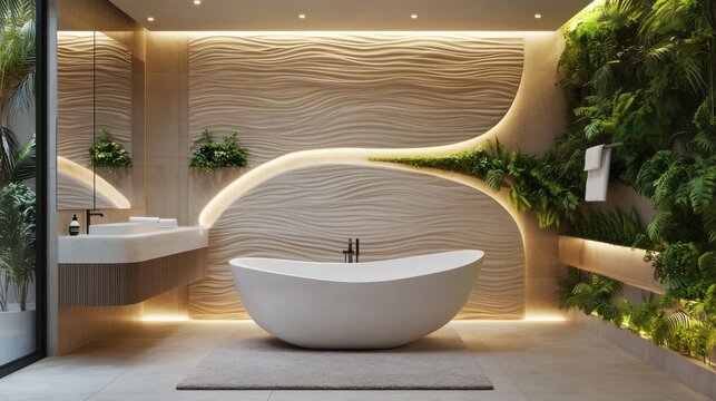 A sculptural marble sink shaped like a flowing ribbon, pure white with grey veining, set in a dark ambient bathroom. Subtle spotlights highlight the sink’s curves,