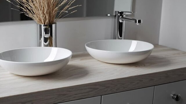 close-up of a modern bathroom featuring two black basins and a sleek matte black faucet