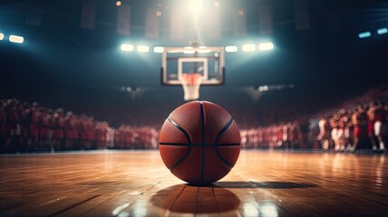 View of sport field, basketball playground, court with indoor spotlights for game, competition. Stages full of fans. 3D rendering illustration.
