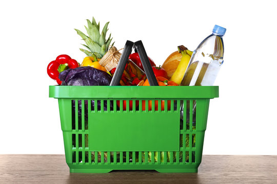 Set of shopping basket, cart, bags with goods flat icons isolated white background. Blue full shop box for website design development. Single simple market object. vector supermarket store elements
