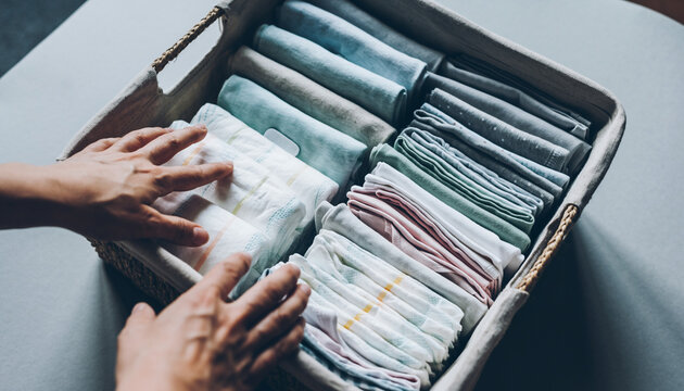 A man is carrying a wicker basket filled with neatly folded laundry, exemplifying the everyday chore of doing laundry and the importance of maintaining order and cleanliness at home.