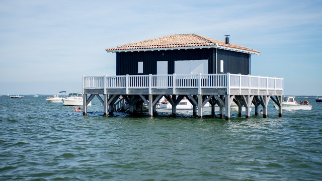 Fishermen houses in Bassin Arcachon, Cabanes Tchanquees, Aerial view, France