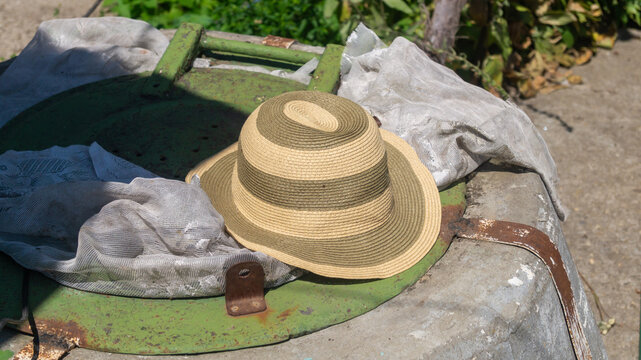 Summer hat with stripes in the sunlight on an iron bassinet lid. A summer headdress. Headdress in the village